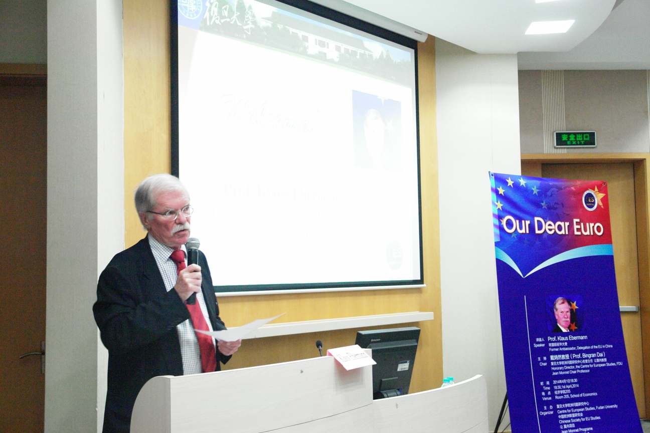 格罗舍先生之后在经济学院大金报告厅进行了题为“欧元和欧洲货币进程—历史、现状和未来”的学术报告。报告由欧洲问题研究中心负责人丁纯教授主持,吸引了校内外师生逾百人。格 罗舍先生根据自己的第一手经验,详解了欧元启动进程以及欧元区目前运行的机制,并对欧元十年中遇到的挑战和机遇、目前欧元区的状况、表现以及在全球金融危机下的未来走向等问题进行了深入浅出的阐述。他风趣幽默的语言也不时引发了阵阵笑声和掌声。格罗舍先生还观众提出的“人民币升值看法”、“欧元未来走向”、“英国是否会加入欧元区”、“欧元区是否能走出危机”等问题一一作了解答。报告结束后,格罗舍先生接受了《东方早报》记者的独家访问。